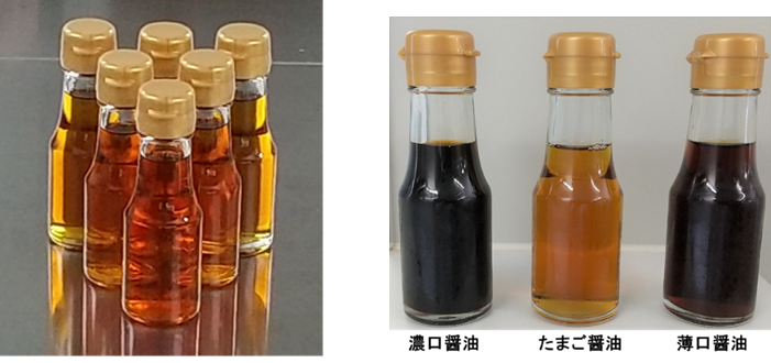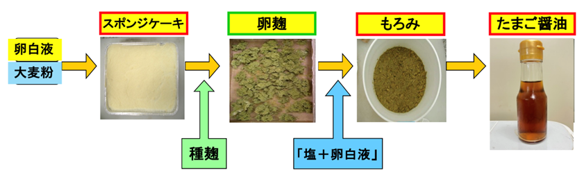 【方法】卵白液と大麦粉でスポンジケーキを作り、そこに麹菌(A. oryzae)をふりかけて培養し、「卵麹」を調製します。そして、「卵麹」に食塩と卵白液を混合したもろみを6ヶ月間発酵熟成させた後、ろ過と火入れ殺菌して「たまご醤油」を調製しました。