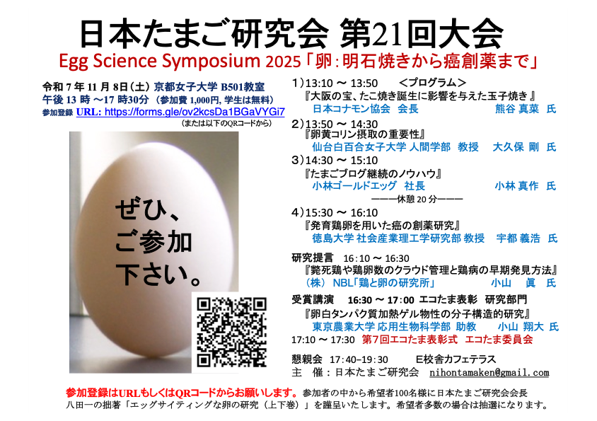 最後に、日本たまご研究会は講演者や参加者の皆さん一人一人が、鶏と卵に関する情報を介して、交流を深めていただくことを最大の目的としています。2004年の設立以来、毎年の研究会を対面開催し、研究会後には懇親会も企画しているのは、正しくそのためです。本コラムご覧の皆さんも、ぜひ11月8日(土)は京都女子大学で開催の第21回日本たまご研究会にご参加ください。参加登録は添付のポスターのURLまたはQRコードからお願いします。なお、第1回目の所長コラムにも書きましたが、11月8日の日本たまご研究会に参加の皆さんには拙著「エッグサイティングな卵の研究(上下巻)」を謹呈します。参加登録時に卵の本希望とお書きください。それでは11月8日(土)の午後にお待ちしています。